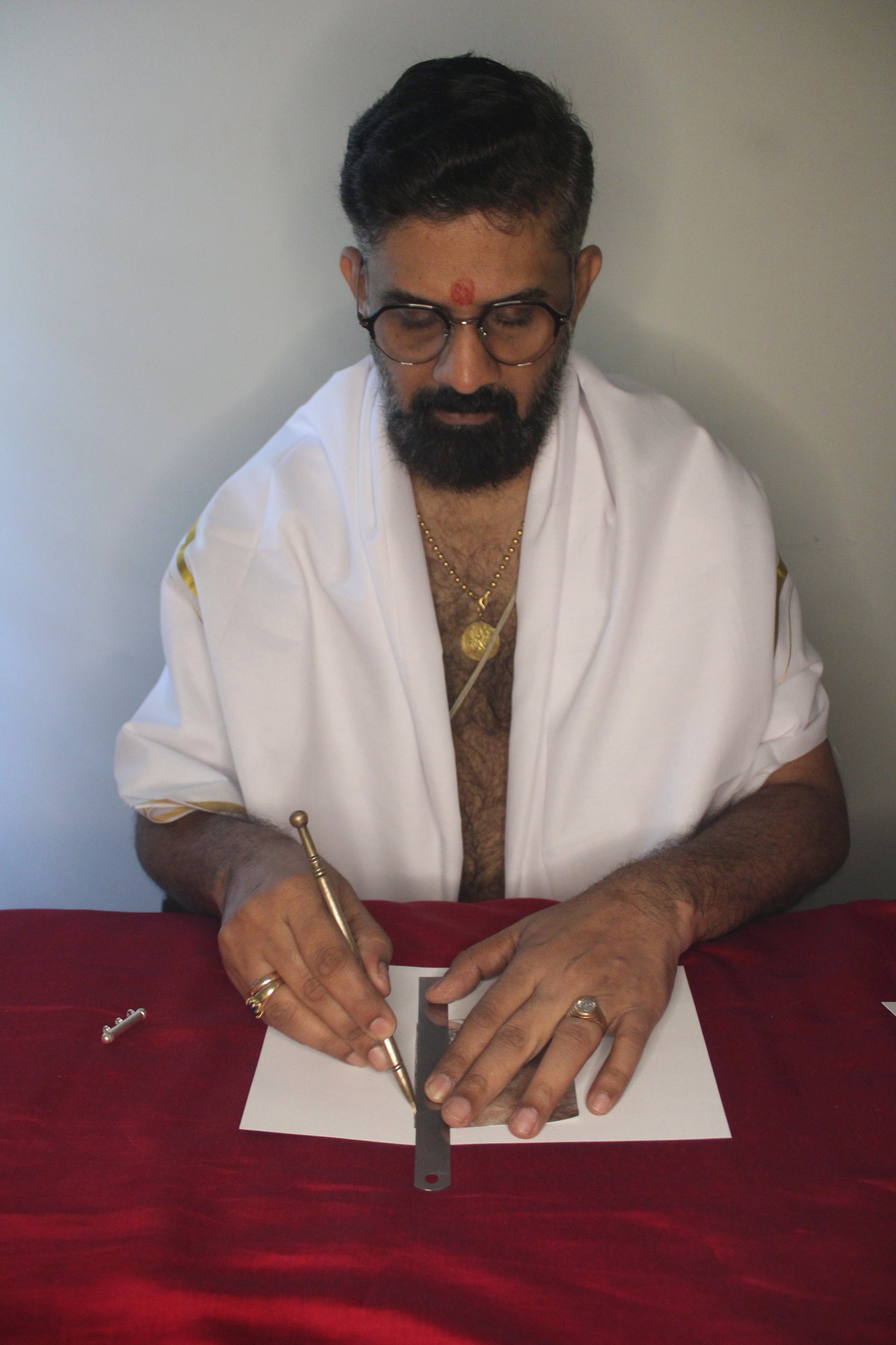 Handwritten by Krishnan Nambuthiripad on silver sheet, energised and inserted inside a silver covering.