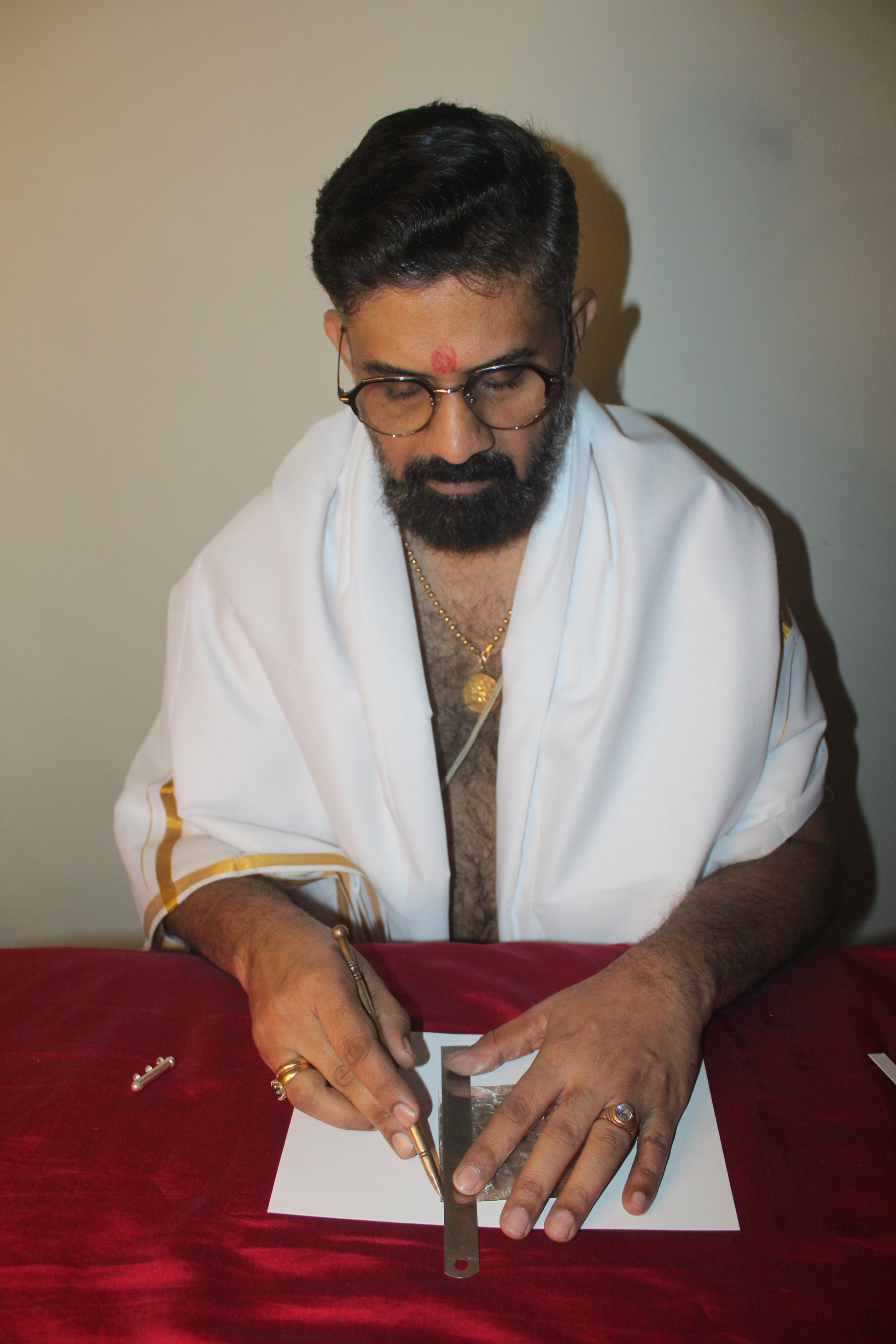 Handwritten by Krishnan Nambuthiripad on silver sheet, energised and inserted inside a silver covering.